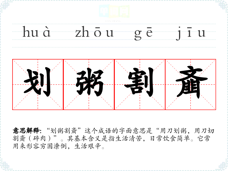 “划粥割齑”这个成语的字面意思是“用刀划粥,用刀切割齑(碎肉)”。其基本含义是指生活清苦,日常饮食简单。它常用来形容穷困潦倒,生活艰辛。