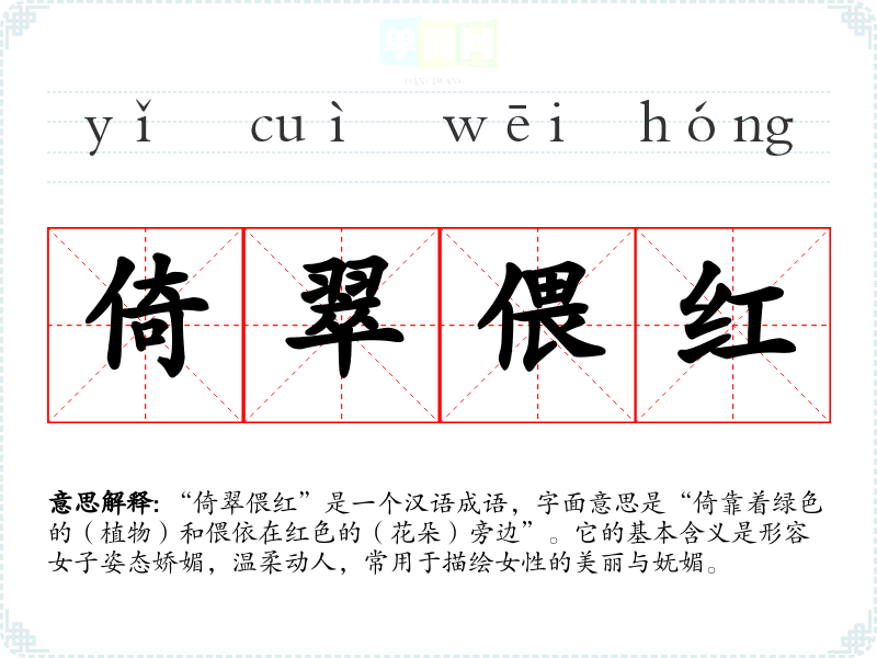 “倚翠偎红”是一个汉语成语,字面意思是“倚靠着绿色的(植物)和偎依在红色的(花朵)旁边”。它的基本含义是形容女子姿态娇媚,温柔动人,常用于描绘女性的美丽与妩媚。