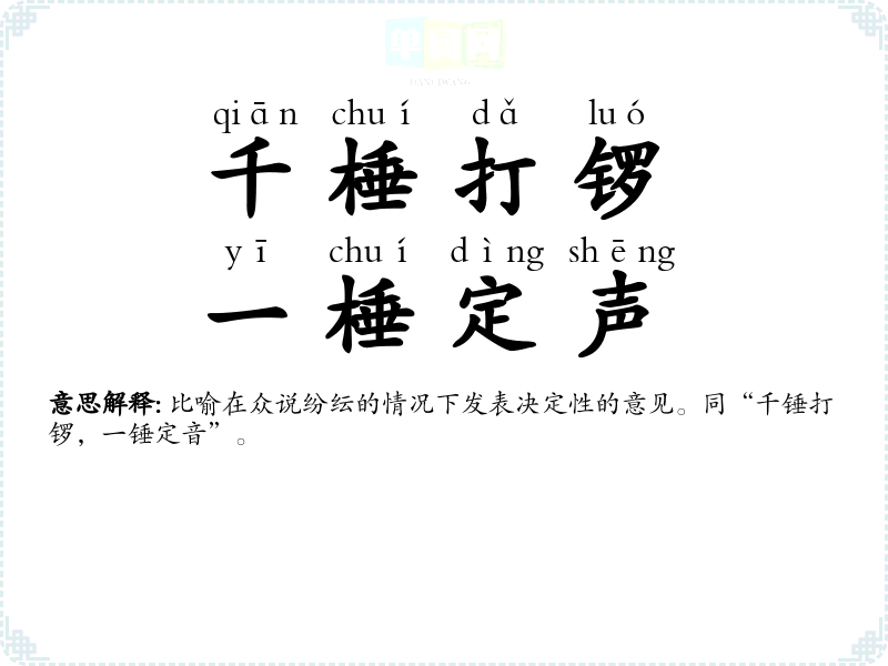| 千锤打锣,一锤定声 | 比喻在众说纷纭的情况下发表决定性的意见。 |