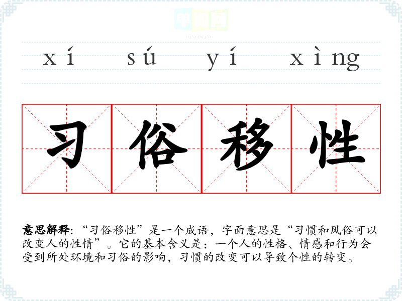 | 习俗移人 | 移:改变;人:指人的本性。风俗习惯可以改变人的习性。 |