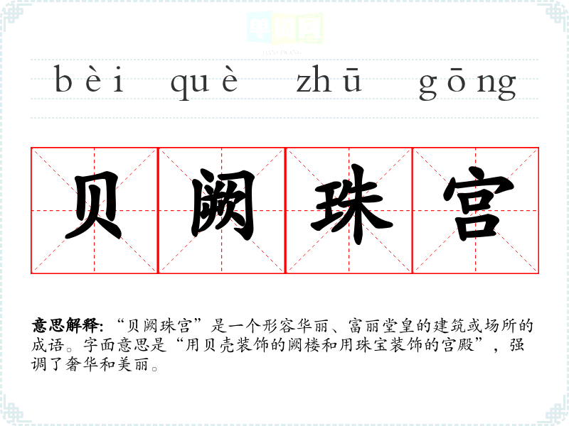 | 珠宫贝阙 | 用珍珠宝贝做的宫殿。形容房屋华丽。 |