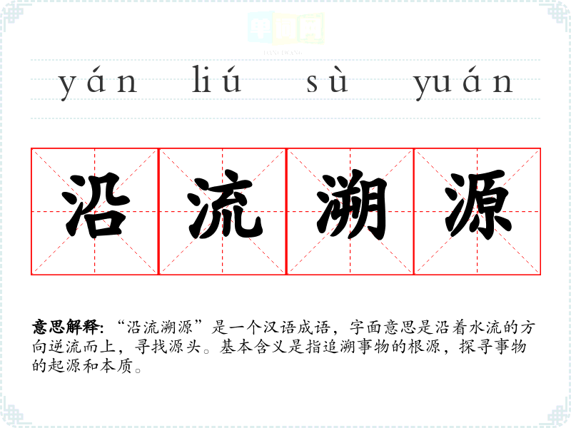 | 沿流溯源 | 沿流:顺着水流;溯源:探索源头。循着水流寻找源头。原比喻作文时由次要的写到主要的,最后点出主题。后比喻探讨事物的本末。 |