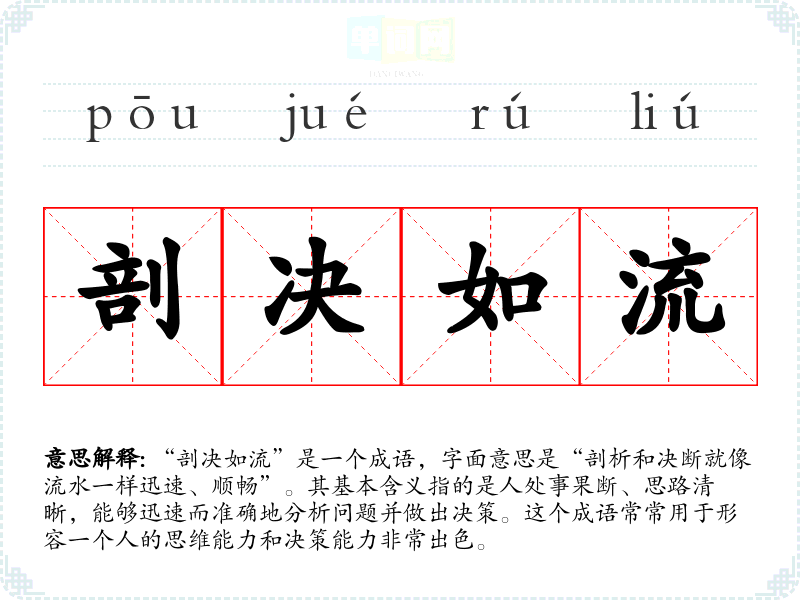 “剖决如流”是一个成语,字面意思是“剖析和决断就像流水一样迅速、顺畅”。其基本含义指的是人处事果断、思路清晰,能够迅速而准确地分析问题并做出决策。这个成语常常用于形容一个人的思维能力和决策能力非常出色。