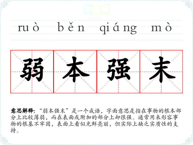 “弱本强末”是一个成语,字面意思是指在事物的根本部分上比较*弱,而在表面或附加的部分上却很强。通常用来形容事物的根基不牢固,表面上看似光鲜亮丽,但实际上缺乏实质性的支持。