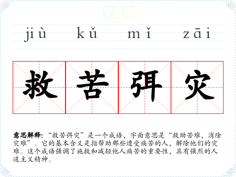 - 济困扶危:指帮助那些处于困境中的人,和“救苦弭灾”相似。