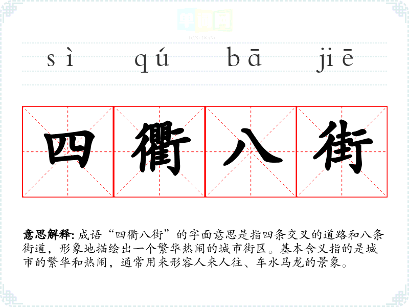 成语“四衢八街”的字面意思是指四条交叉的道路和八条街道,形象地描绘出一个繁华热闹的城市街区。基本含义指的是城市的繁华和热闹,通常用来形容人来人往、车水马龙的景象。