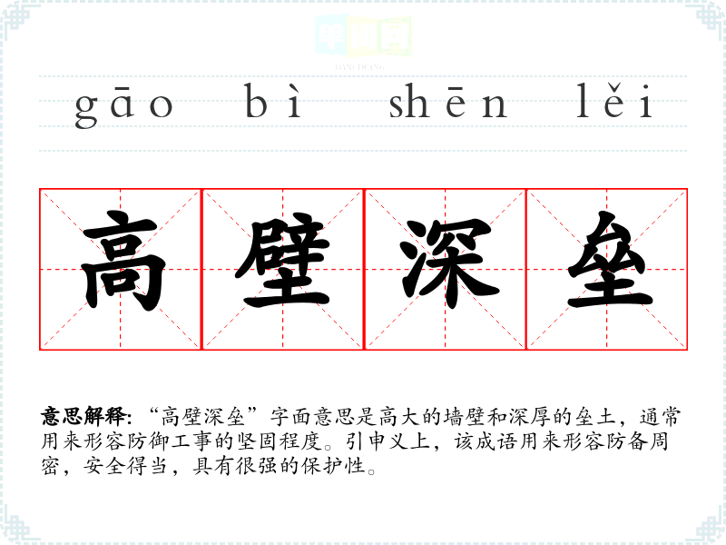 “高壁深垒”字面意思是高大的墙壁和深厚的垒土,通常用来形容防御工事的坚固程度。引申义上,该成语用来形容防备周密,安全得当,具有很强的保护性。