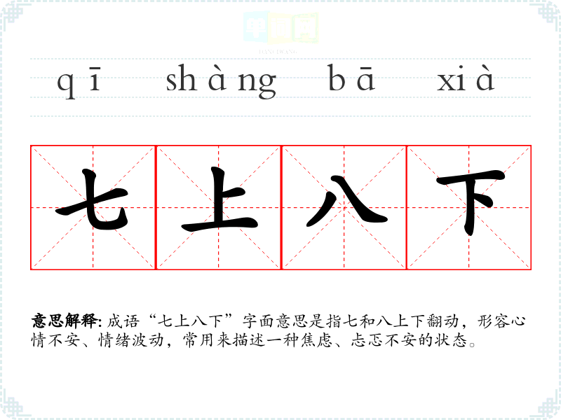 成语“七上八下”字面意思是指七和八上下翻动,形容心情不安、情绪波动,常用来描述一种焦虑、忐忑不安的状态。