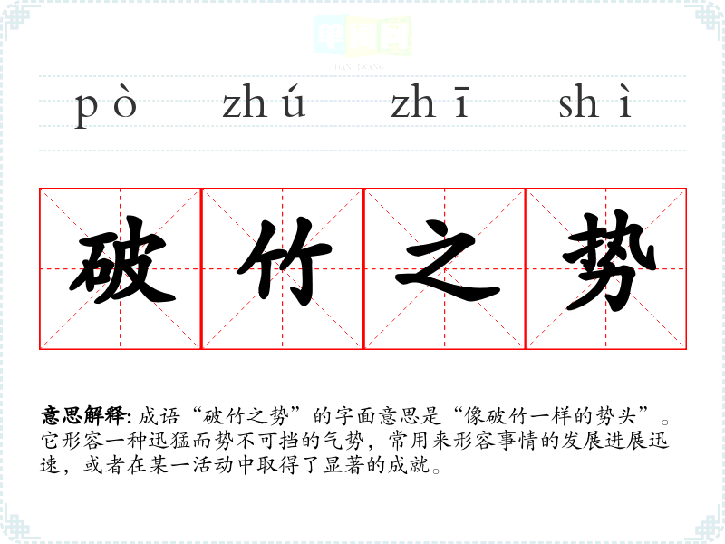 成语“破竹之势”的字面意思是“像破竹一样的势头”。它形容一种迅猛而势不可挡的气势,常用来形容事情的发展进展迅速,或者在某一活动中取得了显著的成就。