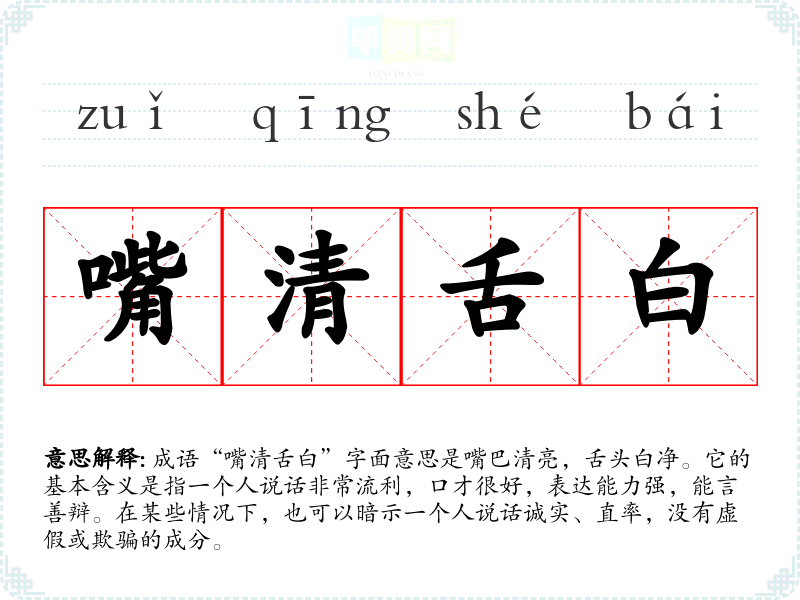成语“嘴清舌白”字面意思是嘴巴清亮,舌头白净。它的基本含义是指一个人说话非常流利,口才很好,表达能力强,能言善辩。在某些情况下,也可以暗示一个人说话诚实、直率,没有虚假或欺骗的成分。