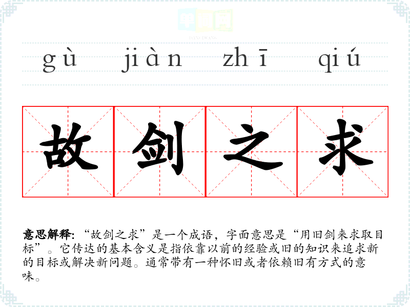 “故剑之求”是一个成语,字面意思是“用旧剑来求取目标”。它传达的基本含义是指依靠以前的经验或旧的知识来追求新的目标或解决新问题。通常带有一种怀旧或者依赖旧有方式的意味。