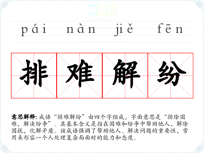 成语“排难解纷”由四个字组成,字面意思是“排除困难,解决纷争”。其基本含义是指在困难和纷争中帮助他人,解除困扰,化解矛盾。该成语强调了帮助他人、解决问题的重要性,常用来形容一个人处理复杂局面时的能力和态度。