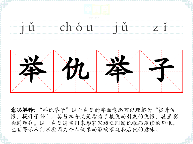 “举仇举子”这个成语的字面意思可以理解为“提升仇恨,提升子孙”。其基本含义是指为了报仇而引发的仇恨,甚至影响到后代。这一成语通常用来形容家族之间因仇恨而延续的怨恨,也有警示人们不要因为个人仇恨而影响家庭和后代的意味。