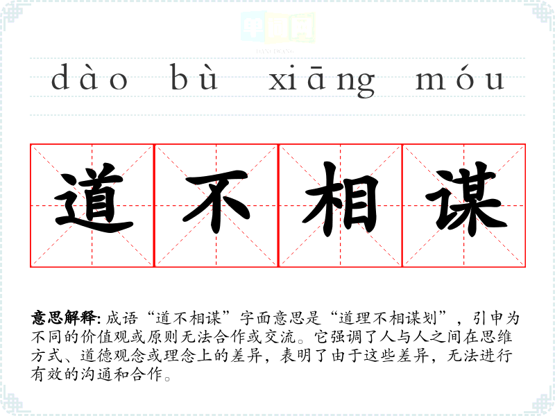 成语“道不相谋”字面意思是“道理不相谋划”,引申为不同的价值观或原则无法合作或交流。它强调了人与人之间在思维方式、道德观念或理念上的差异,表明了由于这些差异,无法进行有效的沟通和合作。