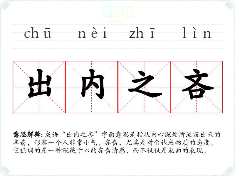 成语“出内之吝”字面意思是指从内心深处所流露出来的吝啬,形容一个人非常小气、吝啬,尤其是对金钱或物质的态度。它强调的是一种深藏于心的吝啬情感,而不仅仅是表面的表现。