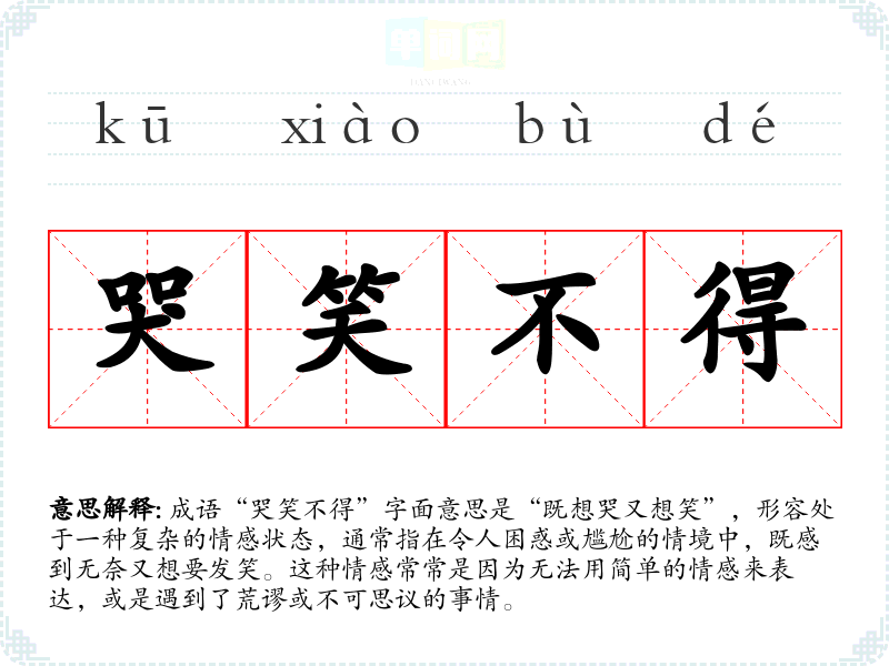 成语“哭笑不得”字面意思是“既想哭又想笑”,形容处于一种复杂的情感状态,通常指在令人困惑或尴尬的情境中,既感到无奈又想要发笑。这种情感常常是因为无法用简单的情感来表达,或是遇到了荒谬或不可思议的事情。