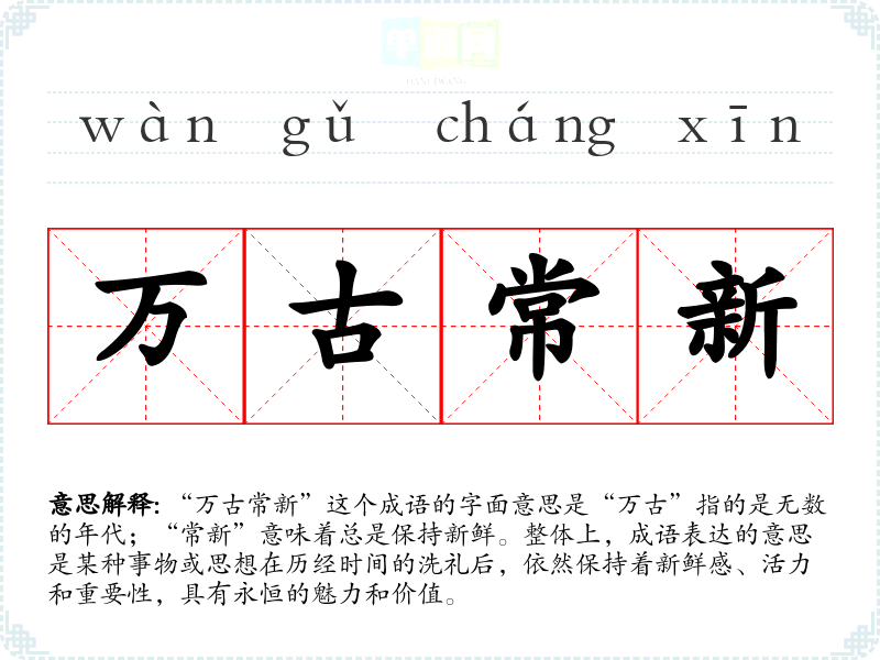“万古常新”这个成语的字面意思是“万古”指的是无数的年代;“常新”意味着总是保持新鲜。整体上,成语表达的意思是某种事物或思想在历经时间的洗礼后,依然保持着新鲜感、活力和重要性,具有永恒的魅力和价值。