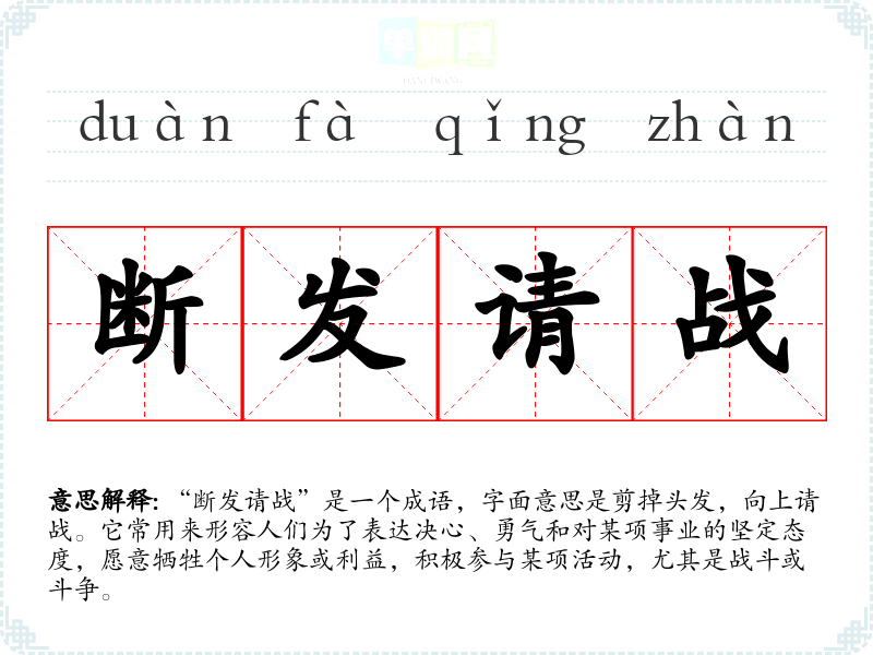 “断发请战”是一个成语,字面意思是剪掉头发,向上请战。它常用来形容人们为了表达决心、勇气和对某项事业的坚定态度,愿意牺牲个人形象或利益,积极参与某项活动,尤其是战斗或斗争。