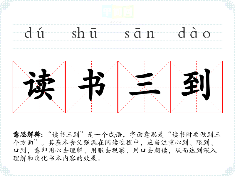 “读书三到”是一个成语,字面意思是“读书时要做到三个方面”。其基本含义强调在阅读过程中,应当注重心到、眼到、口到,意即用心去理解、用眼去观察、用口去朗读,从而达到深入理解和消化书本内容的效果。