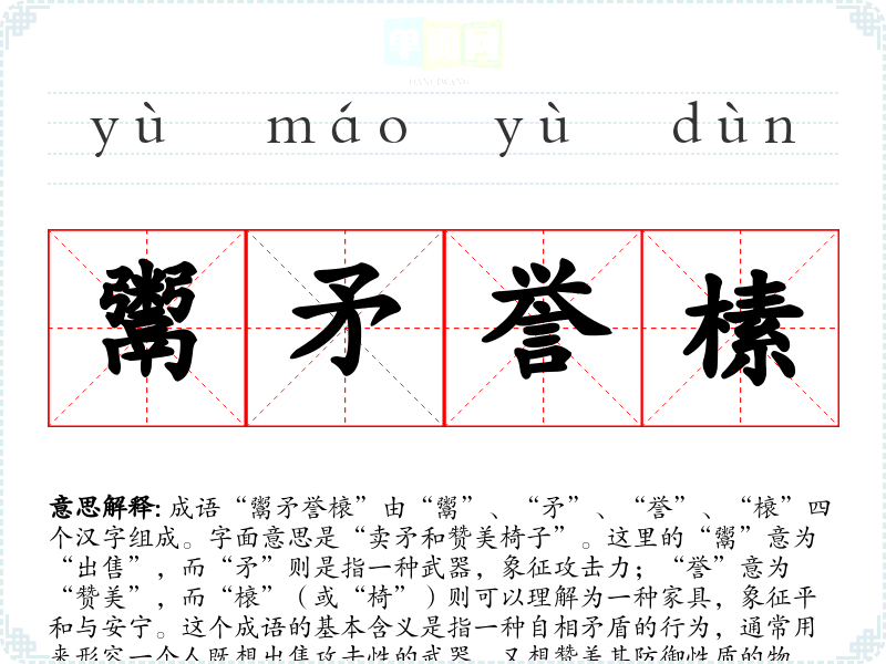 成语“鬻矛誉榱”由“鬻”、“矛”、“誉”、“榱”四个汉字组成。字面意思是“卖矛和赞美椅子”。这里的“鬻”意为“出售”,而“矛”则是指一种武器,象征攻击力;“誉”意为“赞美”,而“榱”(或“椅”)则可以理解为一种家具,象征平和与安宁。这个成语的基本含义是指一种自相矛盾的行为,通常用来形容一个人既想出售攻击性的武器,又想赞美其防御性质的物品,暗示其言行不一致或逻辑上自相矛盾。