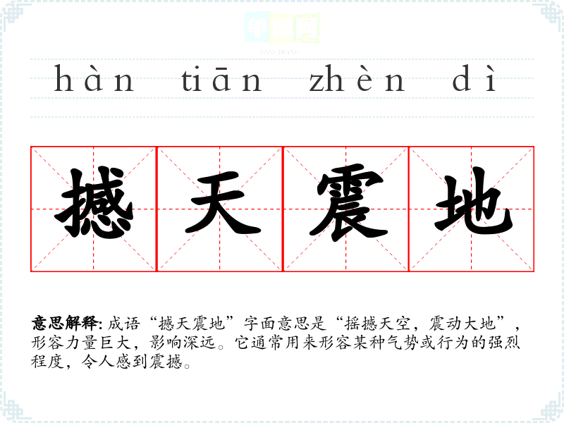 成语“撼天震地”字面意思是“摇撼天空,震动大地”,形容力量巨大,影响深远。它通常用来形容某种气势或行为的强烈程度,令人感到震撼。