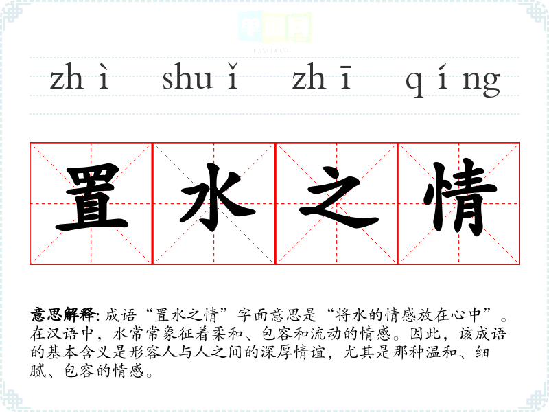 成语“置水之情”字面意思是“将水的情感放在心中”。在汉语中,水常常象征着柔和、包容和流动的情感。因此,该成语的基本含义是形容人与人之间的深厚情谊,尤其是那种温和、细腻、包容的情感。