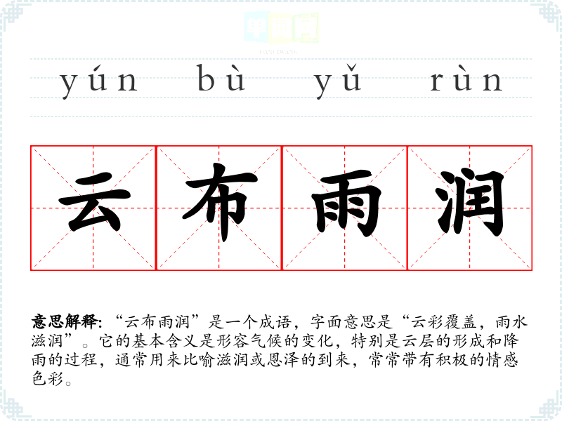 “云布雨润”是一个成语,字面意思是“云彩覆盖,雨水滋润”。它的基本含义是形容气候的变化,特别是云层的形成和降雨的过程,通常用来比喻滋润或恩泽的到来,常常带有积极的情感色彩。