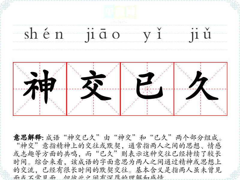 成语“神交已久”由“神交”和“已久”两个部分组成。“神交”意指精神上的交往或默契,通常指两人之间的思想、情感或志趣等方面的共鸣,而“已久”则表示这种交往已经持续了较长时间。综合来看,该成语的字面意思为两人之间通过精神或思想上的交流,已经有很长时间的默契交往。基本含义是指两人虽未曾见面或不常见面,但彼此之间有深厚的理解和感情。