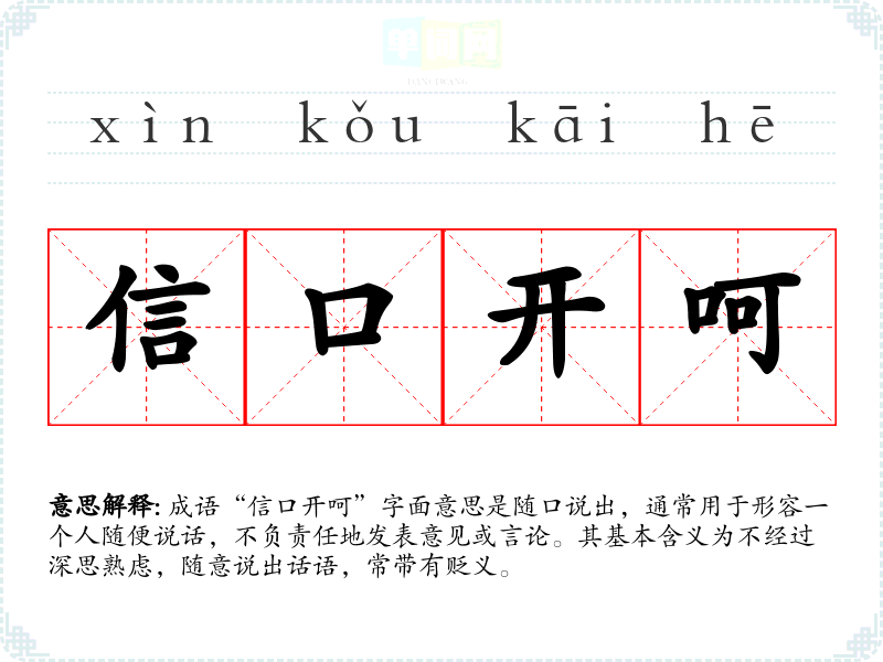 成语“信口开呵”字面意思是随口说出,通常用于形容一个人随便说话,不负责任地发表意见或言论。其基本含义为不经过深思熟虑,随意说出话语,常带有贬义。