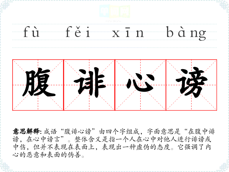 成语“腹诽心谤”由四个字组成,字面意思是“在腹中诽谤,在心中谤言”。整体含义是指一个人在心中对他人进行诽谤或中伤,但并不表现在表面上,表现出一种虚伪的态度。它强调了内心的恶意和表面的伪善。