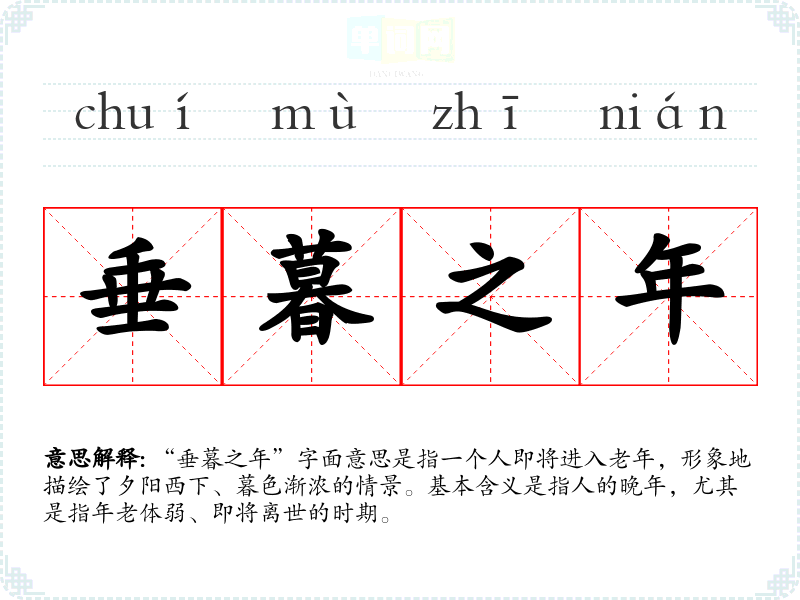 “垂暮之年”字面意思是指一个人即将进入老年,形象地描绘了夕阳西下、暮色渐浓的情景。基本含义是指人的晚年,尤其是指年老体弱、即将离世的时期。