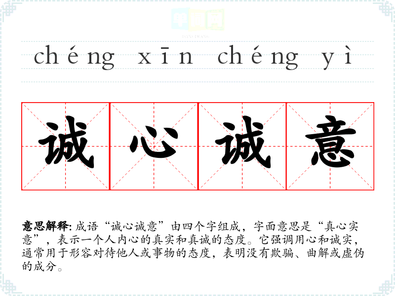 成语“诚心诚意”由四个字组成,字面意思是“真心实意”,表示一个人内心的真实和真诚的态度。它强调用心和诚实,通常用于形容对待他人或事物的态度,表明没有欺骗、曲解或虚伪的成分。