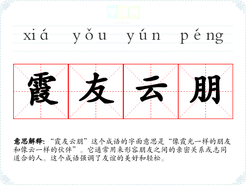 “霞友云朋”这个成语的字面意思是“像霞光一样的朋友和像云一样的伙伴”。它通常用来形容朋友之间的亲密关系或志同道合的人。这个成语强调了友谊的美好和轻松。