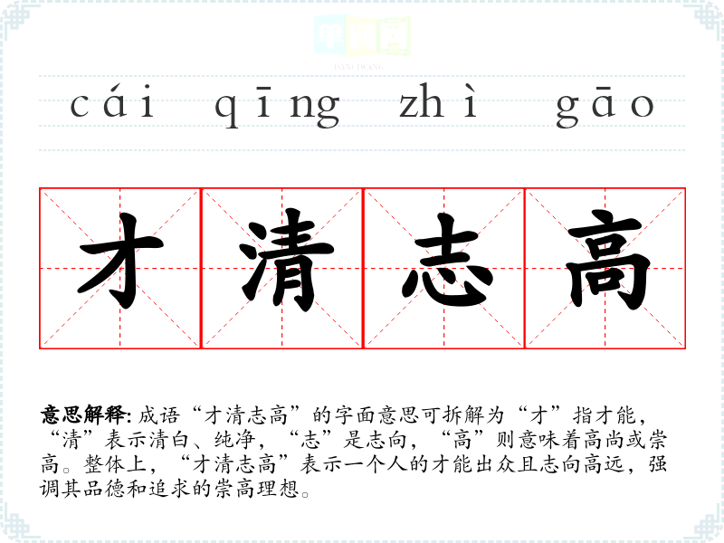 成语“才清志高”的字面意思可拆解为“才”指才能,“清”表示清白、纯净,“志”是志向,“高”则意味着高尚或崇高。整体上,“才清志高”表示一个人的才能出众且志向高远,强调其品德和追求的崇高理想。