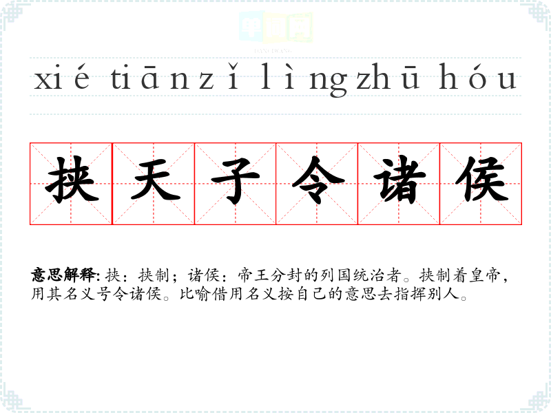 | 挟天子而令诸侯 | 挟:挟制;诸侯:帝王分封的列国统治者。挟制着皇帝,用其名义号令诸侯。比喻借用名义按自己的意思去指挥别人。 |