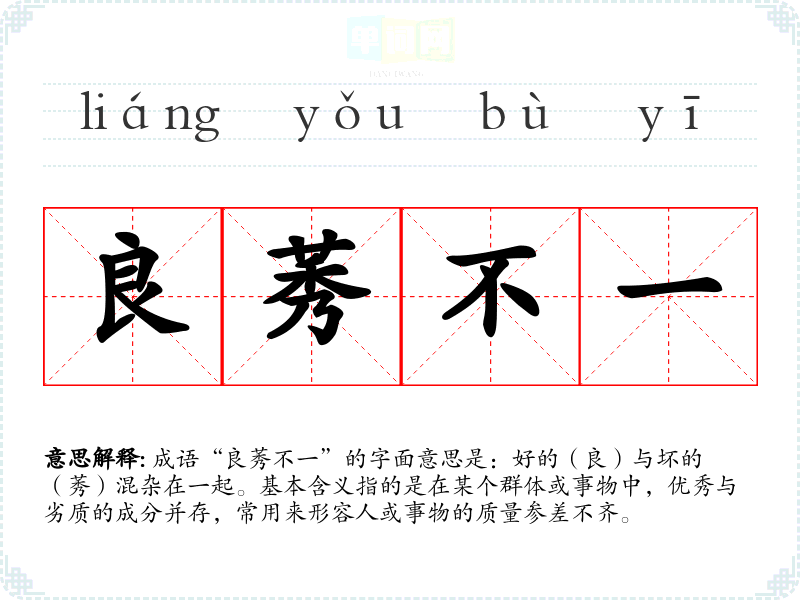 成语“良莠不一”的字面意思是:好的(良)与坏的(莠)混杂在一起。基本含义指的是在某个群体或事物中,优秀与劣质的成分并存,常用来形容人或事物的质量参差不齐。