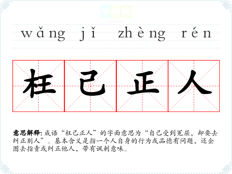成语“枉己正人”的字面意思为“自己受到冤屈,却要去纠正别人”。基本含义是指一个人自身的行为或品德有问题,还企图去指责或纠正他人,带有讽刺意味。