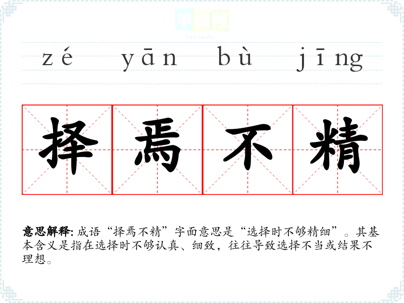 成语“择焉不精”字面意思是“选择时不够精细”。其基本含义是指在选择时不够认真、细致,往往导致选择不当或结果不理想。