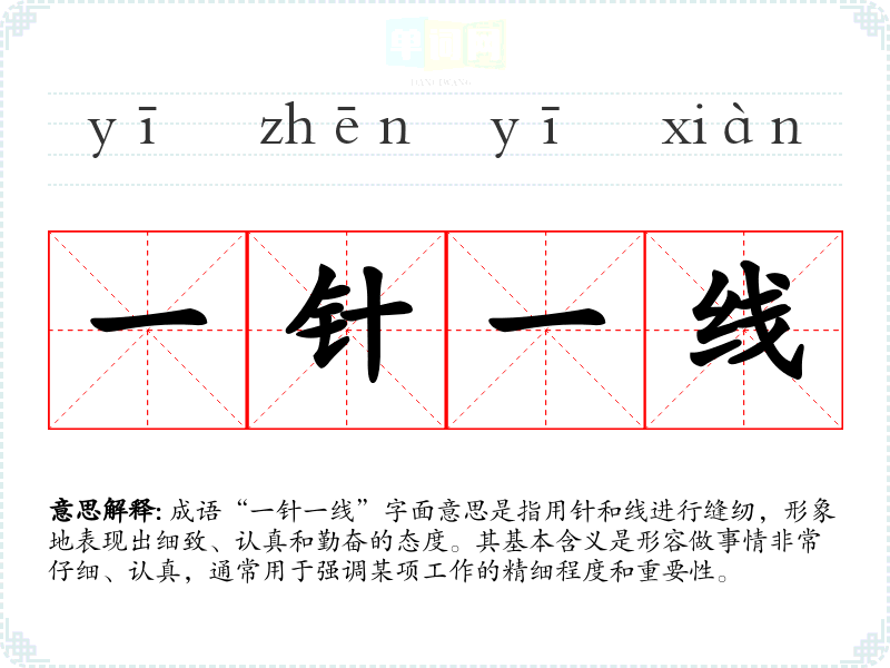 “一针一线”并没有明确的历史典故或文学出处,但其表面意思与传统手工艺密切相关,尤其是缝纫和刺绣等技艺。这些技艺通常需要耐心和细致的态度,因此该成语反映了文化中强调的勤劳和细致的价值观。
