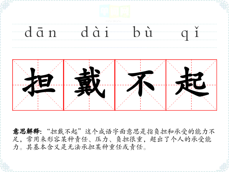 “担戴不起”这个成语字面意思是指负担和承受的能力不足,常用来形容某种责任、压力、负担很重,超出了个人的承受能力。其基本含义是无法承担某种重任或责任。