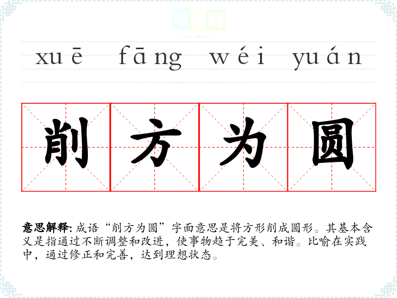 成语“削方为圆”字面意思是将方形削成圆形。其基本含义是指通过不断调整和改进,使事物趋于完美、和谐。比喻在实践中,通过修正和完善,达到理想状态。