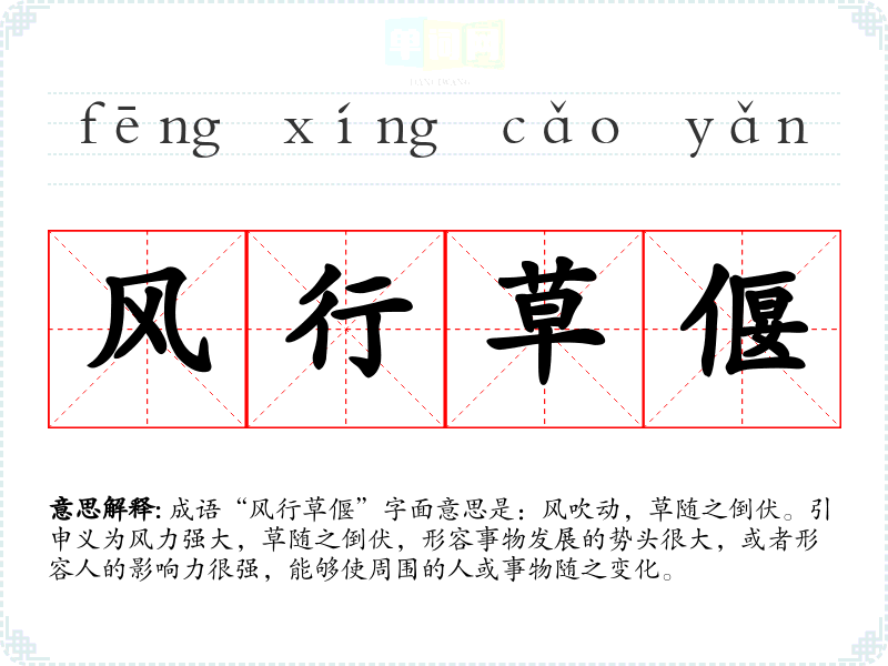 - 日常对话:可以用来形容某个流行趋势的影响力,比如“这个新款手机上市后,风行草偃,大家纷纷购买”。