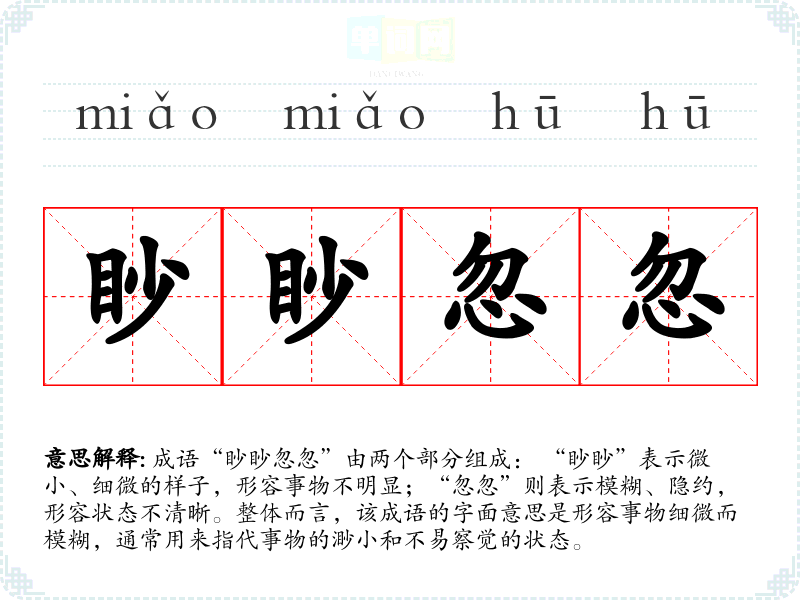 成语“眇眇忽忽”由两个部分组成: “眇眇”表示微小、细微的样子,形容事物不明显;“忽忽”则表示模糊、隐约,形容状态不清晰。整体而言,该成语的字面意思是形容事物细微而模糊,通常用来指代事物的渺小和不易察觉的状态。