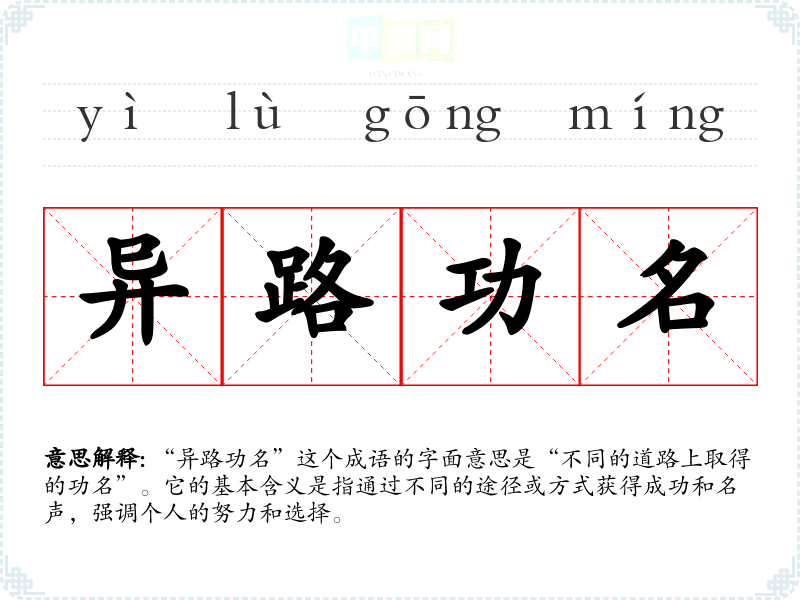 “异路功名”这个成语的字面意思是“不同的道路上取得的功名”。它的基本含义是指通过不同的途径或方式获得成功和名声,强调个人的努力和选择。