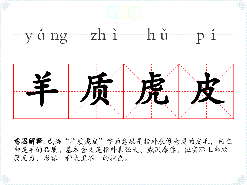 成语“羊质虎皮”字面意思是指外表像**的皮毛,内在却是羊的品质。基本含义是指外表强大、威风凛凛,但实际上却软弱无力,形容一种表里不一的状态。