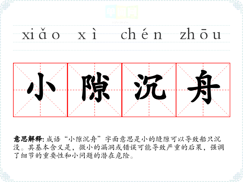 成语“小隙沉舟”字面意思是小的缝隙可以导致船只沉没。其基本含义是,微小的漏洞或错误可能导致严重的后果,强调了细节的重要性和小问题的潜在危险。