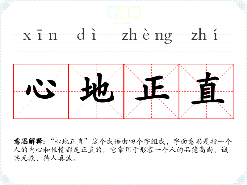 “心地正直”这个成语由四个字组成,字面意思是指一个人的内心和性情都是正直的。它常用于形容一个人的品德高尚、诚实无欺,待人真诚。