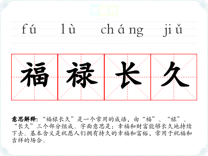 “福禄长久”是一个常用的成语,由“福”、“禄”、“长久”三个部分组成。字面意思是:幸福和财富能够长久地持续下去。基本含义是祝愿人们拥有持久的幸福和富裕,常用于祝福和吉祥的场合。
