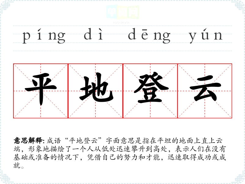 成语“平地登云”字面意思是指在平坦的地面上直上云端,形象地描绘了一个人从低处迅速攀升到高处,表示人们在没有基础或准备的情况下,凭借自己的努力和才能,迅速取得成功或成就。