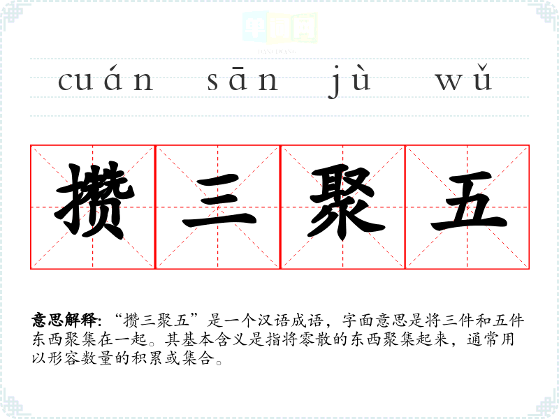 “攒三聚五”是一个汉语成语,字面意思是将三件和五件东西聚集在一起。其基本含义是指将零散的东西聚集起来,通常用以形容数量的积累或集合。